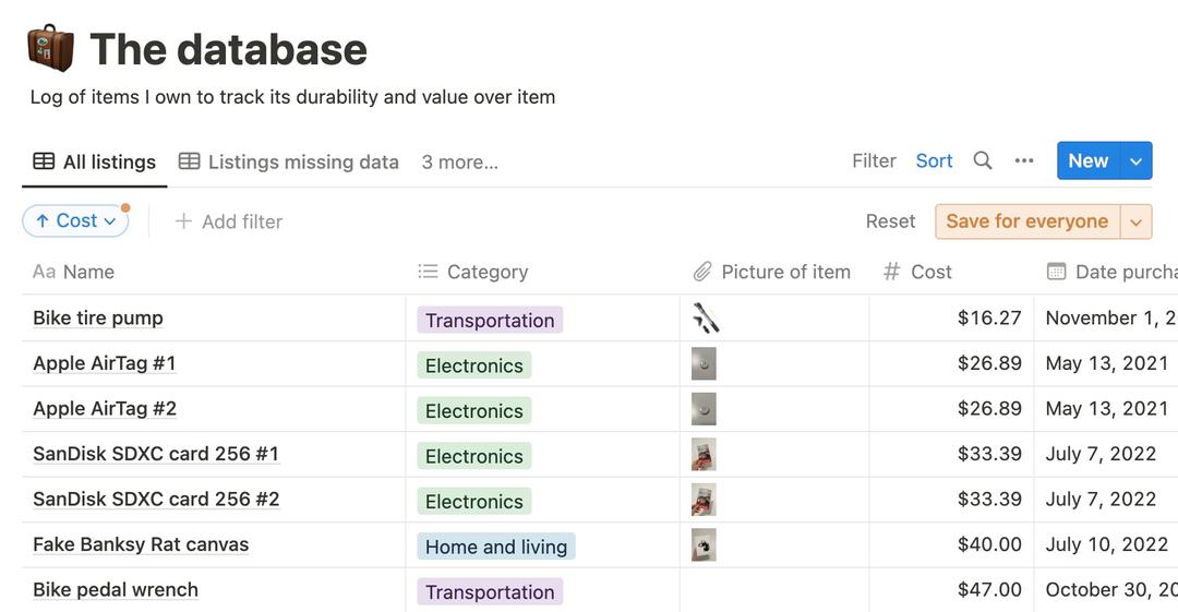 Simultaneously, I'm trying to rewire my terminally engineer brain to avoid overengineering simple ideas or reinventing the wheel. To see test out this idea, I created this table in Notion to track the date of purchase and price of items I own.